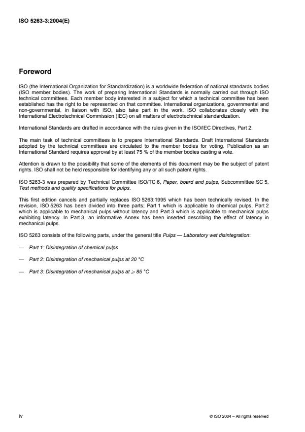 ISO 5263-3:2004 is a standard published by the International Organization for Standardization (ISO). Its full title is "Pulps — Laboratory wet disintegration — Part 3: Disintegration of mechanical pulps at > 85 degrees C". This standard covers: ISO 5263-3:2004 specifies an apparatus and the procedures for the laboratory wet disintegration of mechanical pulps that exhibit latency. This apparatus and procedure are required for preparation of the test portion in a number of other International Standards dealing with pulps. ISO 5263-3:2004 is applicable to all kind of mechanical pulps (i.e. mechanical, semi-chemical and chemo-mechanical pulps) exhibiting latency. Mechanical pulps not exhibiting latency shall be disintegrated according to ISO 5263-2. The procedure specified in ISO 5263-2 should be used to disintegrate all mechanical pulps to be measured for brightness.