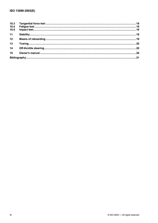 ISO 13590:2003 is a standard published by the International Organization for Standardization (ISO). Its full title is "Small craft — Personal watercraft — Construction and system installation requirements". This standard covers: ISO 13590:2003 applies to personal watercraft, for the construction and installation of builder's plate, permanently installed petrol fuel systems, electrical systems, steering systems, ventilation, hull structure and floatation, and requirements for stability, freeboard and owner's manual.