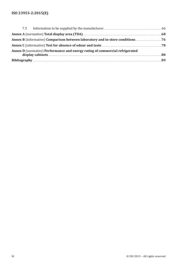 ISO 23953-2:2015 is a standard published by the International Organization for Standardization (ISO). Its full title is "Refrigerated display cabinets - Part 2: Classification, requirements and test conditions". This standard covers: ISO 23953-2:2015 specifies requirements for the construction, characteristics and performance of refrigerated display cabinets used in the sale and display of foodstuffs. It specifies test conditions and methods for checking that the requirements have been satisfied, as well as classification of the cabinets, their marking and the list of their characteristics to be declared by the manufacturer. It is not applicable to refrigerated vending machines. It is also not applicable to cabinets intended for storage or cabinets intended for use, for instance, in catering or non-retail refrigerated applications nor does it cover the choice of the types of foodstuffs chosen to be displayed in the cabinets.