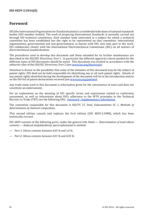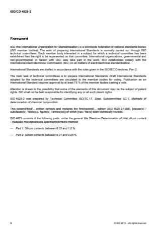 ISO 4829-2:2016 specifies a spectrophotometric method for the determination of total silicon in steels using reduced molybdosilicate. The method is applicable to silicon contents between 0,01 % and 0,05 % (mass fraction) in steels.