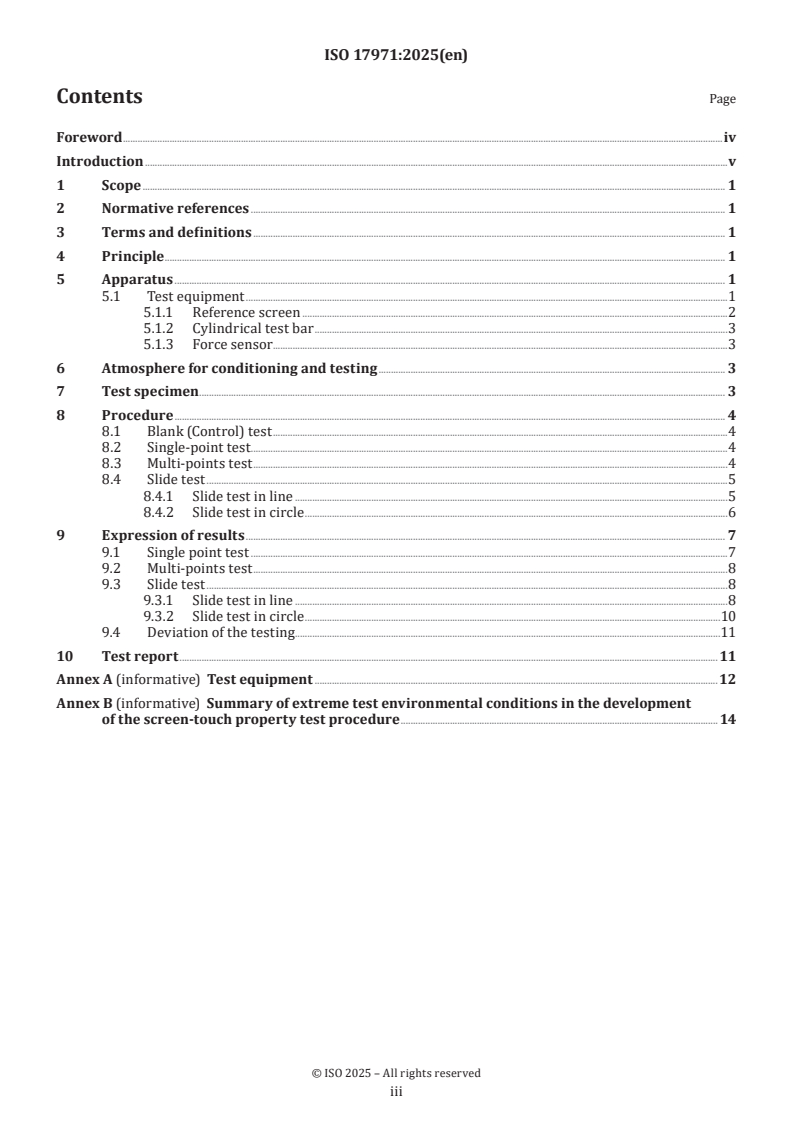 ISO 17971:2025 is a standard published by the International Organization for Standardization (ISO). Its full title is "Textiles - Smart textiles - Test method for determining the screen-touch properties of fabrics". This standard covers: This document specifies a test method for determining the screen-touch properties of fabrics. The method is applicable to all types of fabrics intended for use in products that serve as an interface when handling touchscreens.