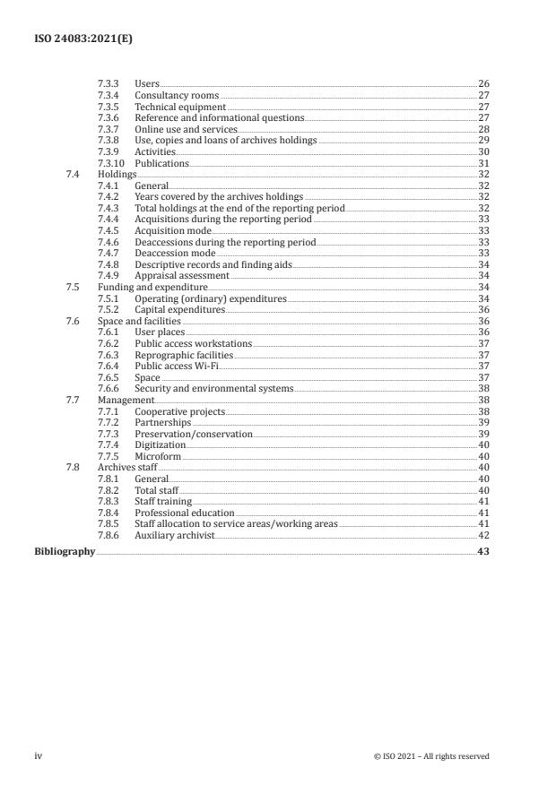ISO 24083:2021 is a standard published by the International Organization for Standardization (ISO). Its full title is "Information and documentation — International archives statistics". This standard covers: This document specifies guidelines for the archives community on the collection and reporting of statistics for the following purposes: — strategic planning and internal management of archives; — aggregating and comparing operational and performance statistics at regional, national, and international levels; — reporting to stakeholders such as funding institutions, politicians, researchers, and the general public; — promoting the role and value of archives for advancing learning and research, education and culture, and social and economic life; — improving the management of processes, reinforcing transparency and supporting good governance. This document does not apply to records centres responsible for records that are still in the legal custody of the organization that created or received them, although it is recognized that some archives also have responsibilities for appraising, acquiring, and managing the current records of organizations that can or not be transferred to the archives for permanent retention. When applying this document to archives that also perform records management functions, the archives can exclude statistics that pertain to its records management functions, including measures pertaining to holdings and their usage and preservation, funding and expenditures, space and facilities, staffing and management.