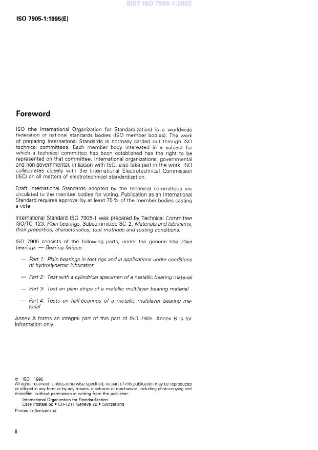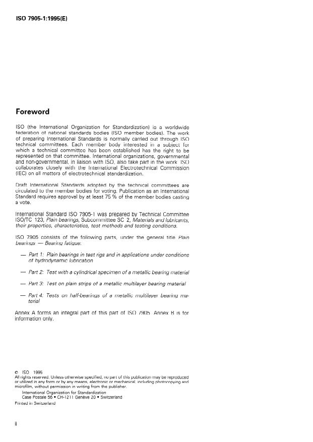 ISO 7905-1:1995 is a standard published by the International Organization for Standardization (ISO). Its full title is "Plain bearings — Bearing fatigue — Part 1: Plain bearings in test rigs and in applications under conditions of hydrodynamic lubrication". This standard covers: Describes a method of improving test result comparability by evaluating the stresses in the bearing layers leading to fatigue. A similar evaluation is required in practical applications. Because the stresses are the result of pressure build-up in the hydrodynamic film, it is essential to fully state the conditions of operation and lubrication. Is restricted to fatigue under full hydrodynamic separation of the bearing surfaces by a lubricant film.