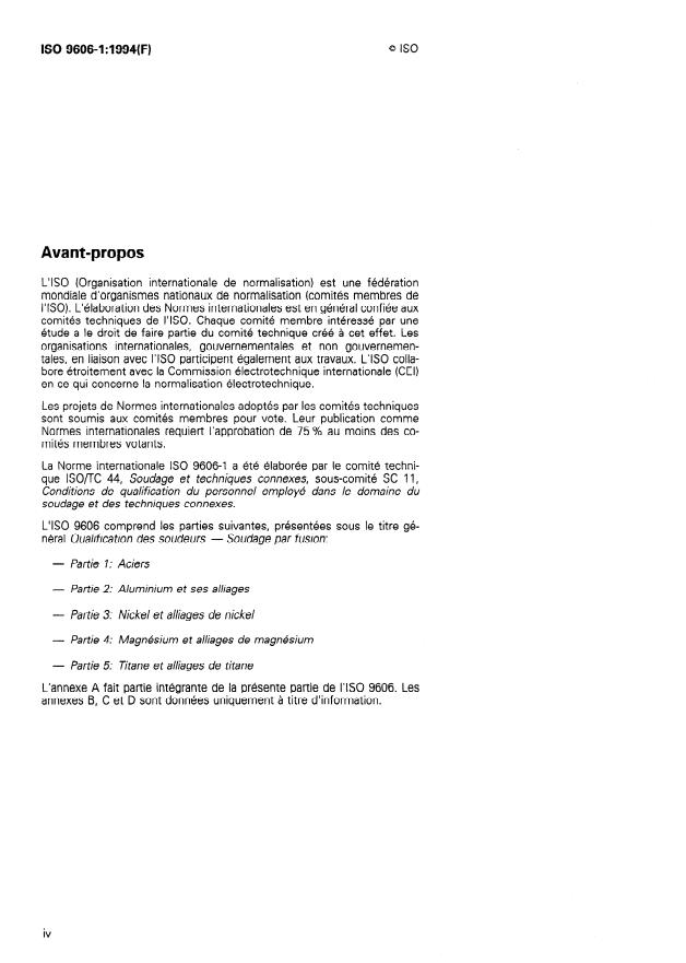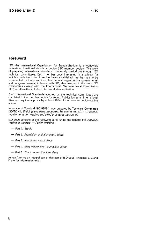 ISO 9606-1:1994 is a standard published by the International Organization for Standardization (ISO). Its full title is "Approval testing of welders — Fusion welding — Part 1: Steels". This standard covers: Specifies essential requirements, ranges of approval, test conditions, acceptance requirements and certification for the approval testing of welder performance for the welding of steels. The recommended format for the certificate of approval testing is given in annex B. Applies to the approval testing of welders for the fusion welding of steels. Covers approval testing of welders for work on semifinished and finished products made from wrought, forged or cast materials types listed in 5.4. Does not cover the issue of the certificate of approval testing which is under the sole responsibility of the examiner or test body.