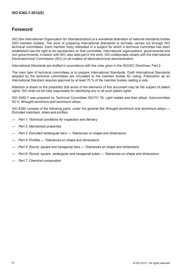ISO 6362-7:2012 is a standard published by the International Organization for Standardization (ISO). Its full title is "Wrought aluminium and aluminium alloys — Extruded rods/bars, tubes and profiles — Part 7: Chemical composition". This standard covers: Wrought aluminium and aluminium alloys — Extruded rods/bars, tubes and profiles — Part 7: Chemical composition