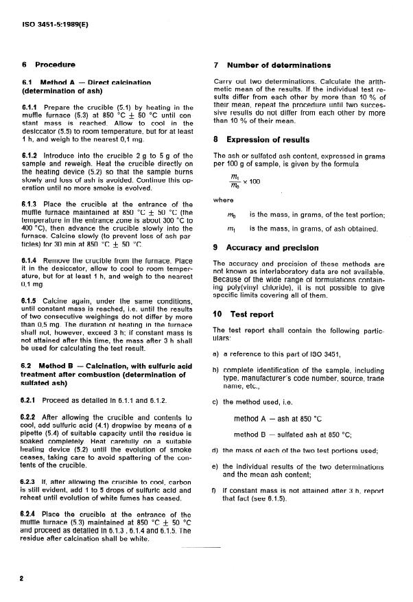 ISO 3451-5:1989 is a standard published by the International Organization for Standardization (ISO). Its full title is "Plastics — Determination of ash — Part 5: Poly(vinyl chloride)". This standard covers: Specifies two methods for the determination of the ash of poly(vinylchloride): method A: direct calcination at 850 grade Celsius until constant mass is reached, and method B sulfated ash with sulfuric acid treatment after combustion and final heating of the residue until constant mass is reached. Method B is recommended if lead compounds are present. The general procedures given in ISO 34511 shall be followed.