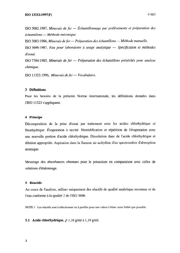 ISO 13312:1997 - Minerais de fer -- Dosage du potassium -- Méthode par spectrométrie d'absorption atomique dans la flamme