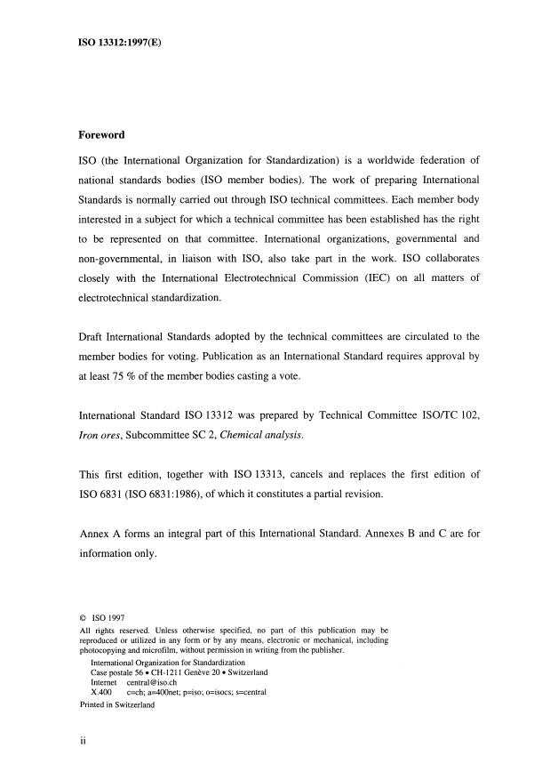 ISO 13312:1997 is a standard published by the International Organization for Standardization (ISO). Its full title is "Iron ores — Determination of potassium content — Flame atomic absorption spectrometric method". This standard covers: Iron ores — Determination of potassium content — Flame atomic absorption spectrometric method