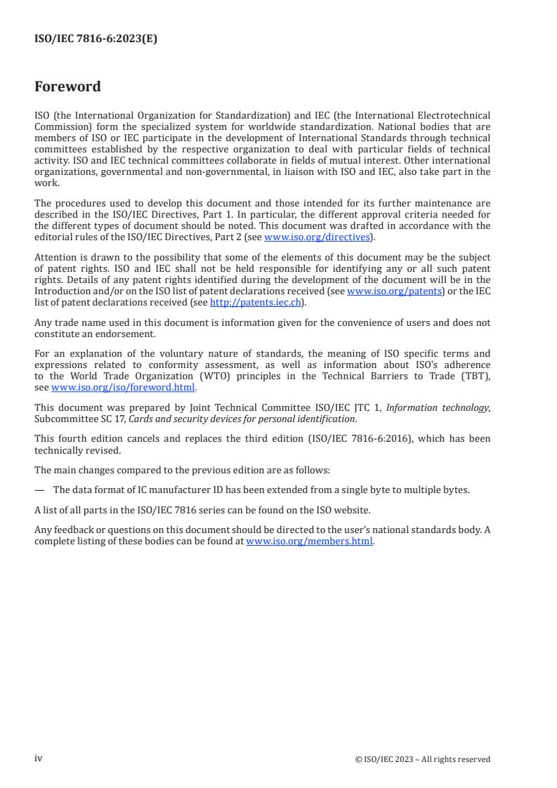 ISO/IEC 7816-6:2023 is a standard published by the International Organization for Standardization (ISO). Its full title is "Identification cards - Integrated circuit cards - Part 6: Interindustry data elements for interchange". This standard covers: This document specifies directly or by reference, data elements, including composite data elements that are applicable to interindustry interchange. It identifies the following characteristics of each data element: - identifier; - name; - description and reference; - format and coding (if not available in other ISO standards or parts of the ISO/IEC 7816 series). The layout of each data element is described as seen at the interface between the interface device and the card. This document provides the definition of data elements without consideration of any restrictions on the usage of the data elements. It does not cover the internal implementation within the card and/or the outside world. With the exception of login data objects (6.5), only application class tags are eligible in this document. When using an interindustry template, an application is allowed to nest context-specific class tags (see ISO/IEC 7816-4) under such a template unless it is previously marked as reserved for future use by ISO/IEC JTC 1/SC 17.