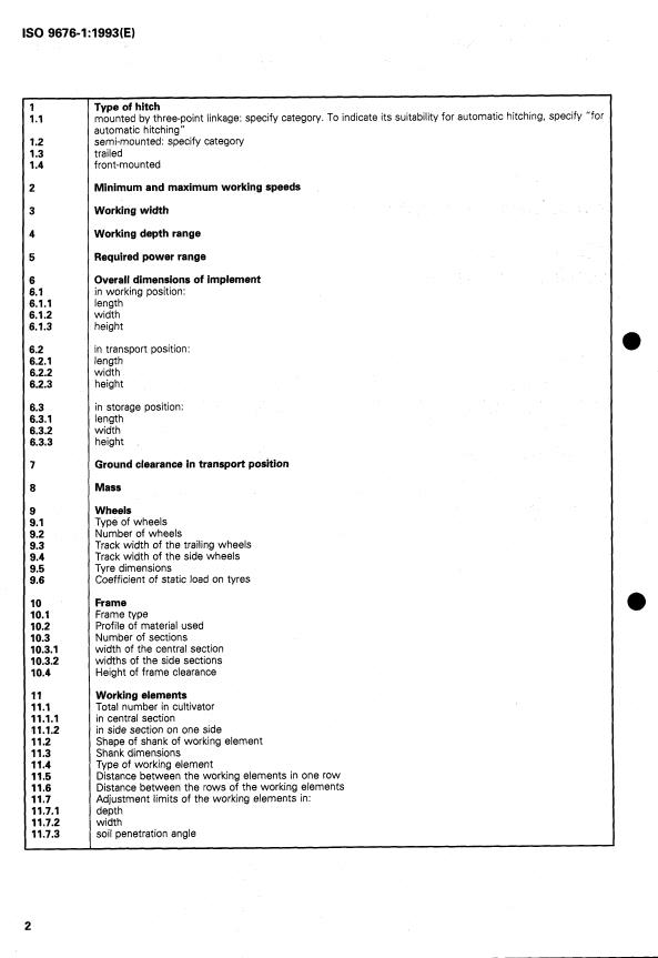 ISO 9676-1:1993 is a standard published by the International Organization for Standardization (ISO). Its full title is "Agricultural field cultivators — Part 1: Specification system". This standard covers: Agricultural field cultivators — Part 1: Specification system