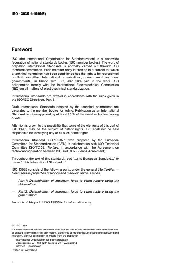 ISO 13935-1:1999 is a standard published by the International Organization for Standardization (ISO). Its full title is "Textiles — Seam tensile properties of fabrics and made-up textile articles — Part 1: Determination of maximum force to seam rupture using the strip method". This standard covers: Textiles — Seam tensile properties of fabrics and made-up textile articles — Part 1: Determination of maximum force to seam rupture using the strip method