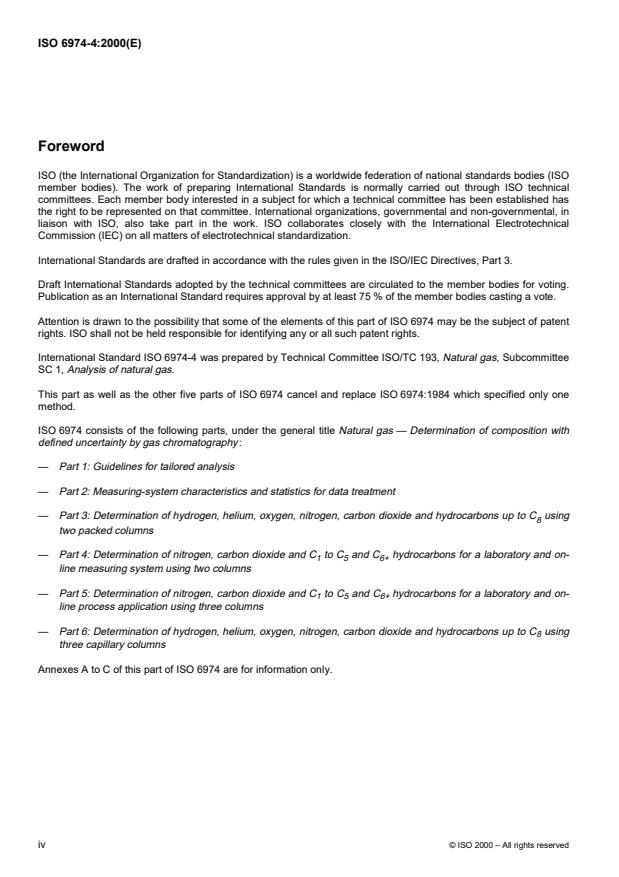ISO 6974-4:2000 is a standard published by the International Organization for Standardization (ISO). Its full title is "Natural gas - Determination of composition with defined uncertainty by gas chromatography - Part 4: Determination of nitrogen, carbon dioxide and C1 to C5 and C6+ hydrocarbons for a laboratory and on-line measuring system using two columns". This standard covers: L'ISO 6974-4:2000 décrit une méthode par chromatographie en phase gazeuse pour la détermination quantitative de constituants du gaz naturel, à l'aide d'un système à deux colonnes. Cette méthode est applicable aux déterminations réalisées dans des processus en continu ou en laboratoire. Elle est applicable à l'analyse de gaz contenant des constituants dans les limites des gammes de fractions molaires indiquées au Tableau 1 de l'ISO 6974-4:2000. Ces gammes ne représentent pas les limites de détection, mais les limites à l'intérieur desquelles s'applique la fidélité spécifiée de la méthode. Même si la présence d'un ou de plusieurs constituants d'un échantillon est susceptible de ne pas être détectée, la méthode peut tout de même être applicable. L'ISO 6974-4:2000 n'est applicable que conjointement avec l'ISO 6974-1 et l'ISO 6974-2.