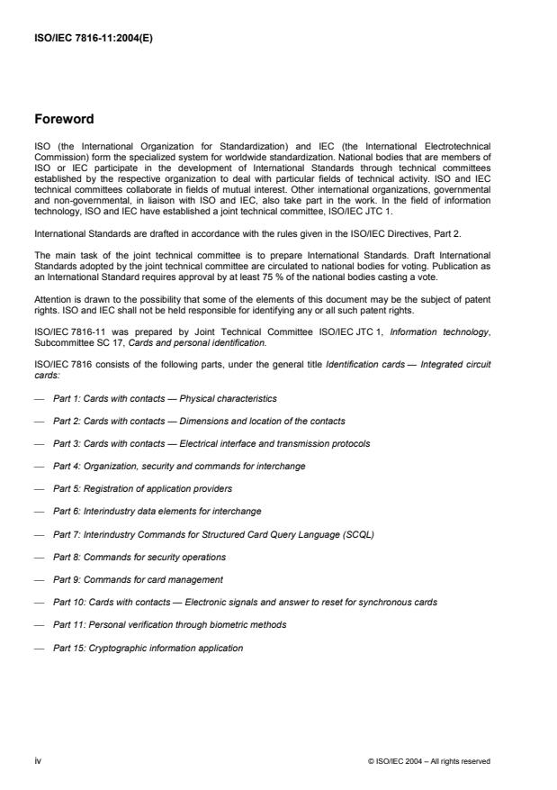 ISO/IEC 7816-11:2004 is a standard published by the International Organization for Standardization (ISO). Its full title is "Identification cards — Integrated circuit cards — Part 11: Personal verification through biometric methods". This standard covers: ISO/IEC 7816-11:2004 specifies the usage of interindustry commands and data objects related to personal verification through biometric methods in integrated circuit cards. The interindustry commands used are defined in ISO/IEC 7816-4. The data objects are partially defined in this International Standard, partially imported from ISO/IEC 19785-1. ISO/IEC 7816-11 also presents examples for enrollment and verification and addresses security issues.