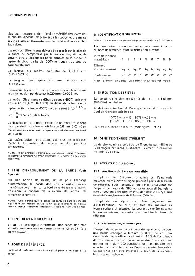 ISO 1862:1975 - Traitement de l'information -- Bande magnétique a 9 pistes, de 12,7 mm (0,5 in) de large, pour l'échange d'information, enregistrée a 8 rangées par millimetre (200 rpi)