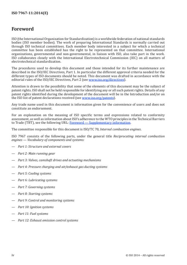 ISO 7967-11:2014 is a standard published by the International Organization for Standardization (ISO). Its full title is "Reciprocating internal combustion engines — Vocabulary of components and systems — Part 11: Fuel systems". This standard covers: ISO 7967-11:2014 establishes a vocabulary for fuel systems of reciprocating internal combustion engines. Also, in ISO 7967-11:2014, the terms and the definitions are classified as follows: ? fuel supply system (3.1); ? carburetor (3.2); ? fuel injection system (3.3). ISO 2710‑1 gives a classification of reciprocating internal combustion engines and denotes the basic terms and definitions of such engines and their characteristics.