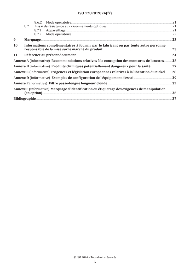 ISO 12870:2024 is a standard published by the International Organization for Standardization (ISO). Its full title is "Ophthalmic optics - Spectacle frames - Requirements and test methods". This standard covers: This document specifies fundamental requirements and their test methods for unglazed spectacle frames designed for use with prescription lenses. It is applicable to spectacle frames at the point of sale by the manufacturer or supplier to the retailer. This document is applicable to: - all mass-produced spectacle frame types, including rimless mounts, semi-rimless mounts and folding spectacle frames; - spectacle frames made with additive manufacturing, for example, 3D printing; - spectacle frames made from natural organic materials; - the frame or mount of clip-ons designed specifically for attachment to particular models of spectacle frame, but not to their lenses or filters to which ISO 16034 or ISO 12312-1 apply; - prescription inserts designed for attachment to particular models of, for example, eye protector, sunglass or diving mask. Parts of this document are applicable to custom-made frames – see 3.1.3 and Table 1. NOTE See Annex A for recommendations on the design of spectacle frames and terms to be used when describing metal frames. This document is not applicable to spectacle frames used in eye protection, where ISO 16321-1 applies, or to sunglasses with afocal filters, where ISO 12312-1 applies.