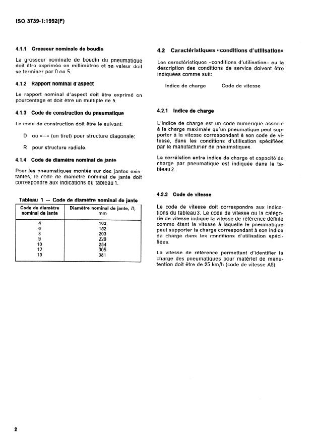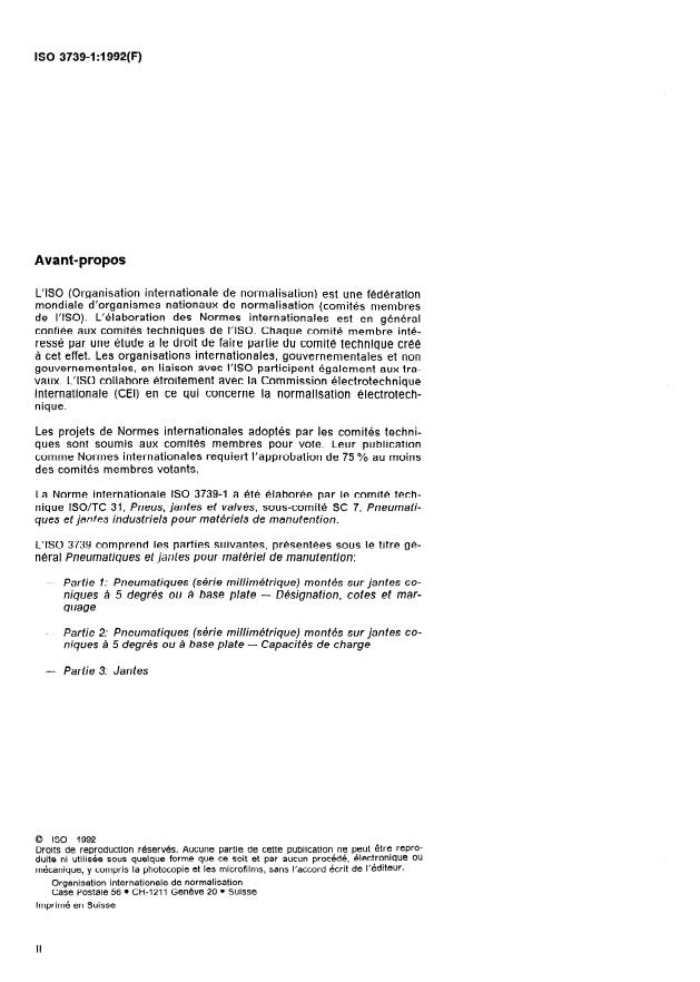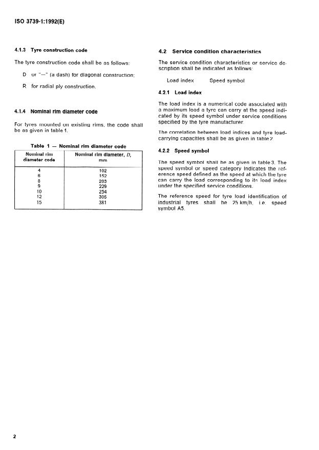 ISO 3739-1:1992 is a standard published by the International Organization for Standardization (ISO). Its full title is "Industrial tyres and rims — Part 1: Pneumatic tyres (metric series) on 5 degrees tapered or flat base rims — Designation, dimensions and marking". This standard covers: Applies to tyres primarily intended for industrial vehicles for use on prepared surfaces. The tyres are based on the following parameters: speeds not exceeding 50 km/h, rim diameters not exceeding rim diameter code of 15.