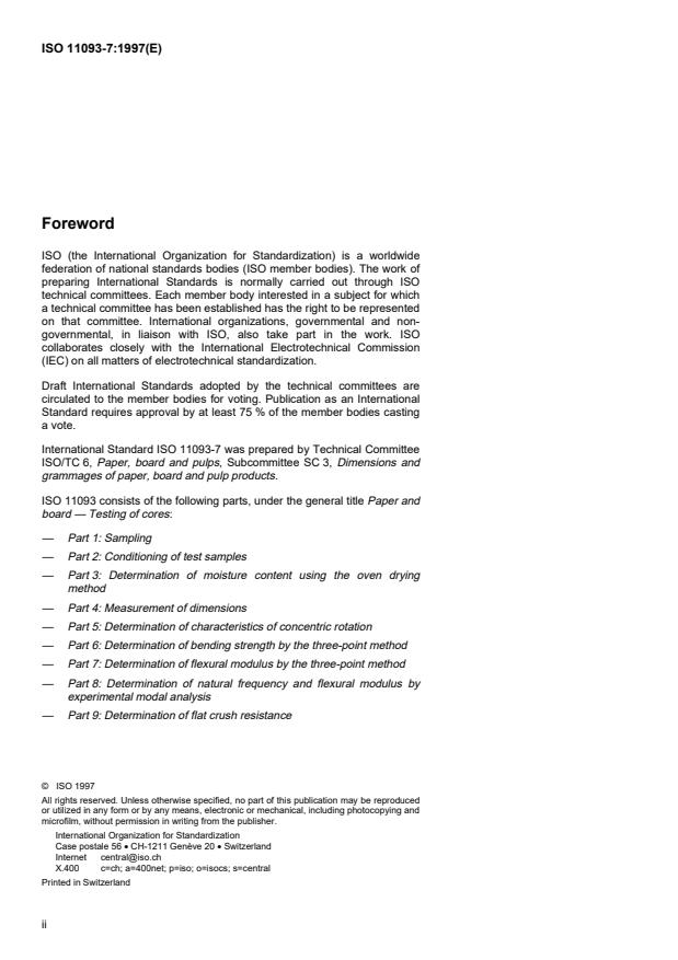 ISO 11093-7:1997 is a standard published by the International Organization for Standardization (ISO). Its full title is "Paper and board — Testing of cores — Part 7: Determination of flexural modulus by the three-point method". This standard covers: Paper and board — Testing of cores — Part 7: Determination of flexural modulus by the three-point method