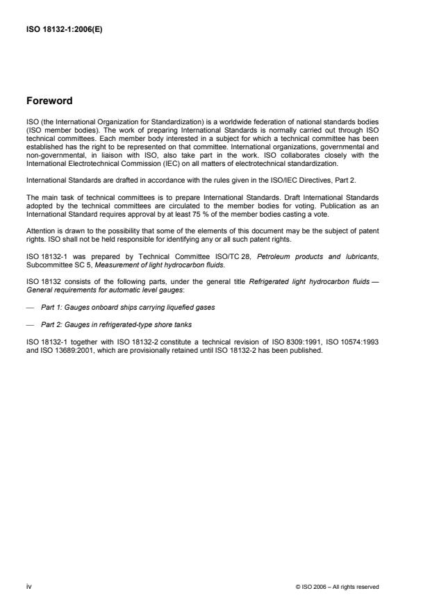 ISO 18132-1:2006 is a standard published by the International Organization for Standardization (ISO). Its full title is "Refrigerated light hydrocarbon fluids — General requirements for automatic level gauges — Part 1: Gauges onboard ships carrying liquefied gases". This standard covers: ISO 18132-1:2006 gives general requirements for the specification, installation and testing of level gauges used in the measurement of liquid levels on board ships carrying refrigerated light hydrocarbon fluids at close to atmospheric pressure (mainly LNG/LPG).