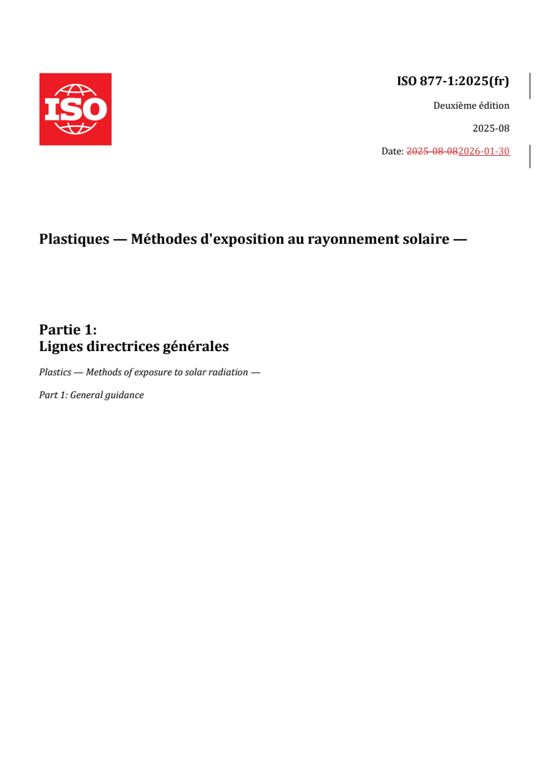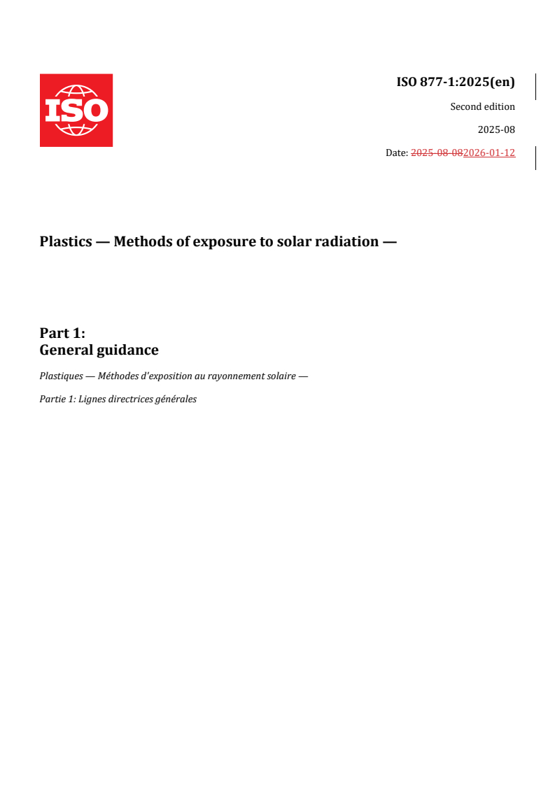 ISO 877-1:2025 - Plastics — Methods of exposure to solar radiation — Part 1: General guidance Released:7. 08. 2025