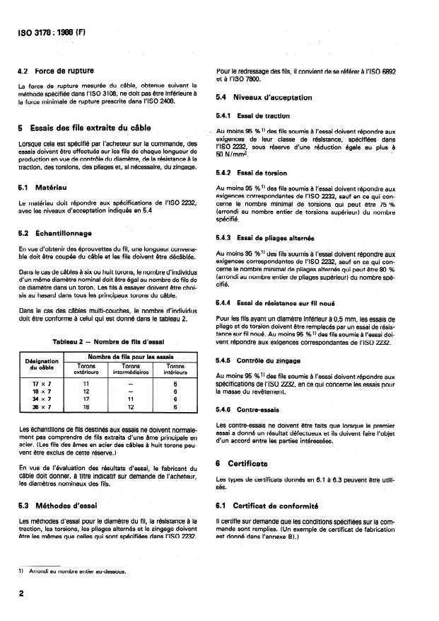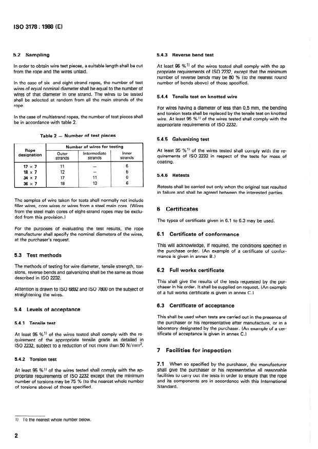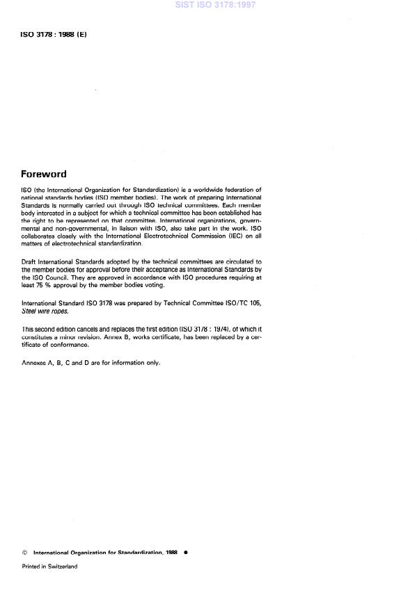 ISO 3178:1988 is a standard published by the International Organization for Standardization (ISO). Its full title is "Steel wire ropes for general purposes — Terms of acceptance". This standard covers: This second edition cancels and replaces the first edition (ISO 3178:1974), of which it constitutes a minor revision. Annex B, works certificate, has been replaced by a certificate of conformance. Specifies tests on ropes, tests on wires from the rope, certificates, inspection facilities, packaging.