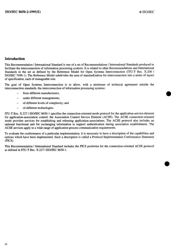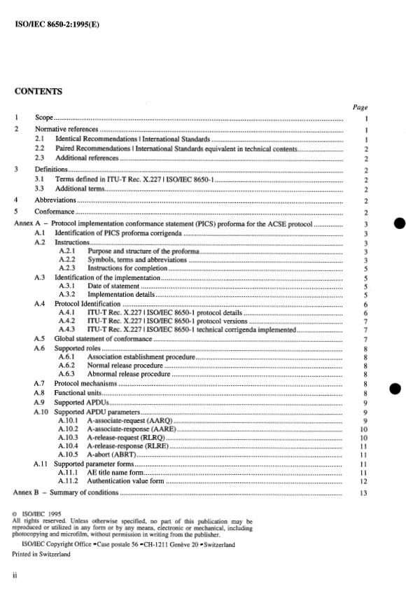 ISO/IEC 8650-2:1995 is a standard published by the International Organization for Standardization (ISO). Its full title is "Information technology — Open Systems Interconnection — Protocol specification for the Association Control Service Element: Protocol Implementation Conformance Statement (PICS) proforma". This standard covers: Information technology — Open Systems Interconnection — Protocol specification for the Association Control Service Element: Protocol Implementation Conformance Statement (PICS) proforma