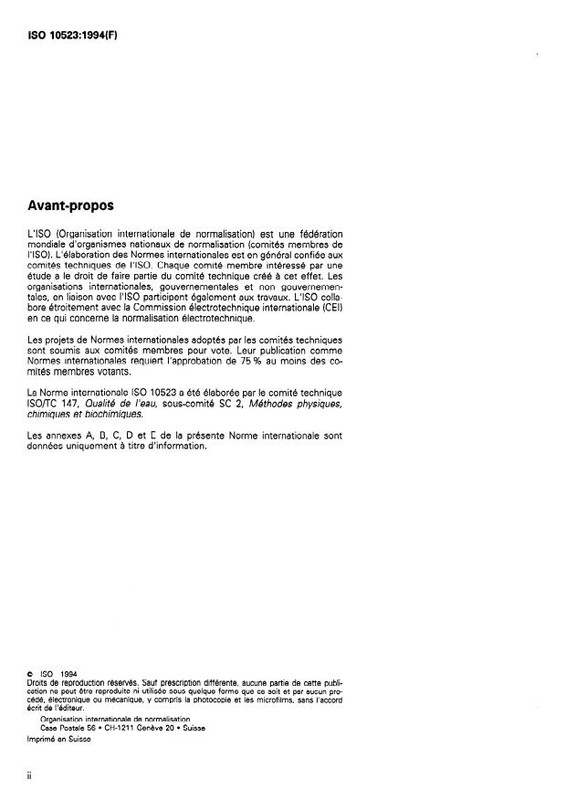 ISO 10523:1994 - Qualité de l'eau -- Détermination du pH
