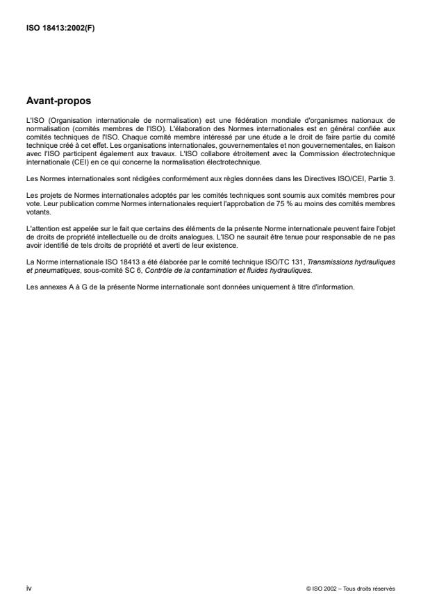 L'ISO 18413 décrit le contenu d'un document de contrôle comprenant tant les exigences de propreté applicables à la pièce ou au composant spécifié(e) que la méthode de contrôle à employer pour évaluer son niveau de propreté. Les exigences de propreté et la méthode de contrôle doivent être établies et convenues entre les parties intéressées. L'ISO 18413 est applicable aux surfaces mouillées de toute pièce ou de tout composant d'un système de transmission hydraulique. Elle ne couvre pas les défauts d'aspect ni la contamination par des matières liquides ou gazeuses. L'ISO 18413 ne traite pas des questions de sécurité que peuvent entraîner les matières, les opérations et les matériels dangereux associés à son utilisation. L'utilisateur de l'ISO 18413 est chargé d'établir des pratiques de sécurité et d'hygiène appropriées et de déterminer l'applicabilité des restrictions légales avant l'utilisation.