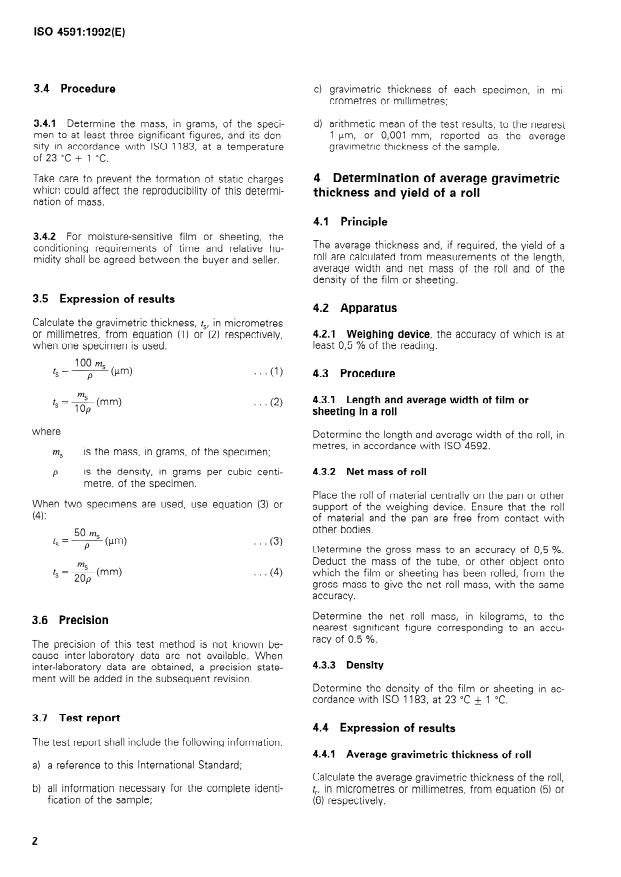 ISO 4591:1992 is a standard published by the International Organization for Standardization (ISO). Its full title is "Plastics - Film and sheeting - Determination of average thickness of a sample, and average thickness and yield of a roll, by gravimetric techniques (gravimetric thickness)". This standard covers: Applies to all plastics films and sheeting and has special value when mechanical scanning is not sufficiently precise, particularly for measuring the thickness of embossed sheeting. The gravimetric thickness is calculated from measurements of mass, area and density of a sample.