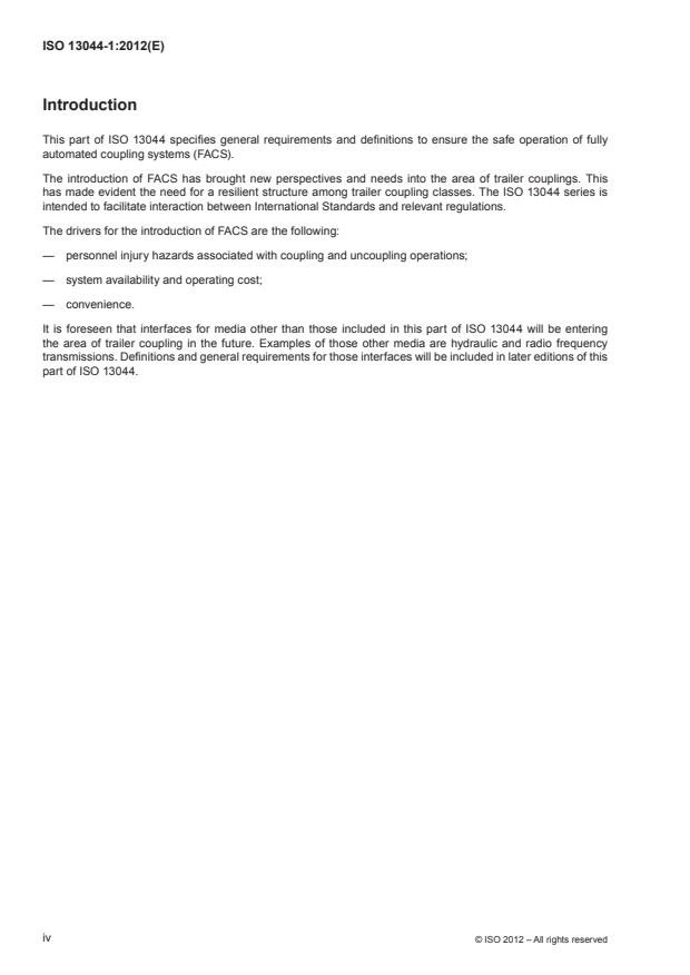 ISO 13044-1:2012 is an international standard developed by the International Organization for Standardization (ISO) that establishes general requirements and definitions for 24 V fully automatic coupling systems (FACS) used in heavy commercial vehicle combinations. This standard focuses on creating a resilient framework for standardized coupling interfaces between towing vehicles and trailers, particularly for those with a technical maximum mass exceeding 3,500 kg. The goal is to ensure the safe and efficient operation of fully automatic coupling systems, improving safety, reducing operating costs, and increasing convenience in heavy vehicle operations.
