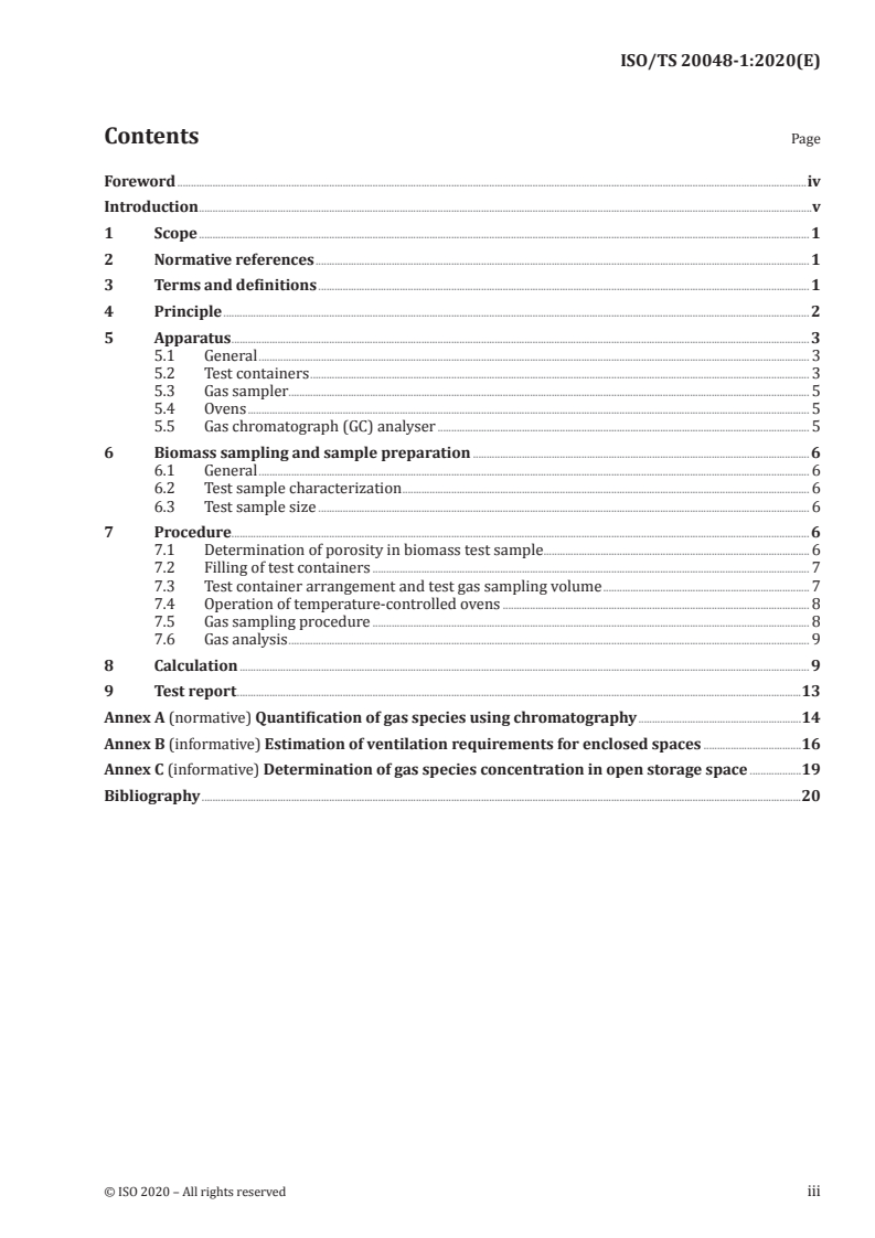 ISO/TS 20048-1:2020 is a technical specification published by the International Organization for Standardization (ISO). Its full title is "Solid biofuels — Determination of off-gassing and oxygen depletion characteristics — Part 1: Laboratory method for the determination of off-gassing and oxygen depletion using closed containers". This standard covers: This document defines a method for determination of off-gassing (permanent gases) and oxygen depletion from woody as well as non-woody biomass, including densified materials such as pellets and briquettes, as well as non-densified materials such as chips. The method is also applicable for thermally treated materials, including torrefied and carbonized materials. The emission and depletion factor and emission and depletion rate for various gas species emitted from sample within a closed test container is determined by means of gas chromatography. The emission and depletion factor and emission and depletion rate provide guidance for ventilation requirements to keep gas concentrations below Permissible Exposure Levels (PEL) in spaces where workers can be exposed to the enclosed atmosphere.