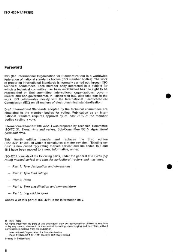 ISO 4251-1:1992 is a standard published by the International Organization for Standardization (ISO). Its full title is "Tyres (ply rating marked series) and rims for agricultural tractors and machines — Part 1: Tyre designation and dimensions". This standard covers: Tyres (ply rating marked series) and rims for agricultural tractors and machines — Part 1: Tyre designation and dimensions