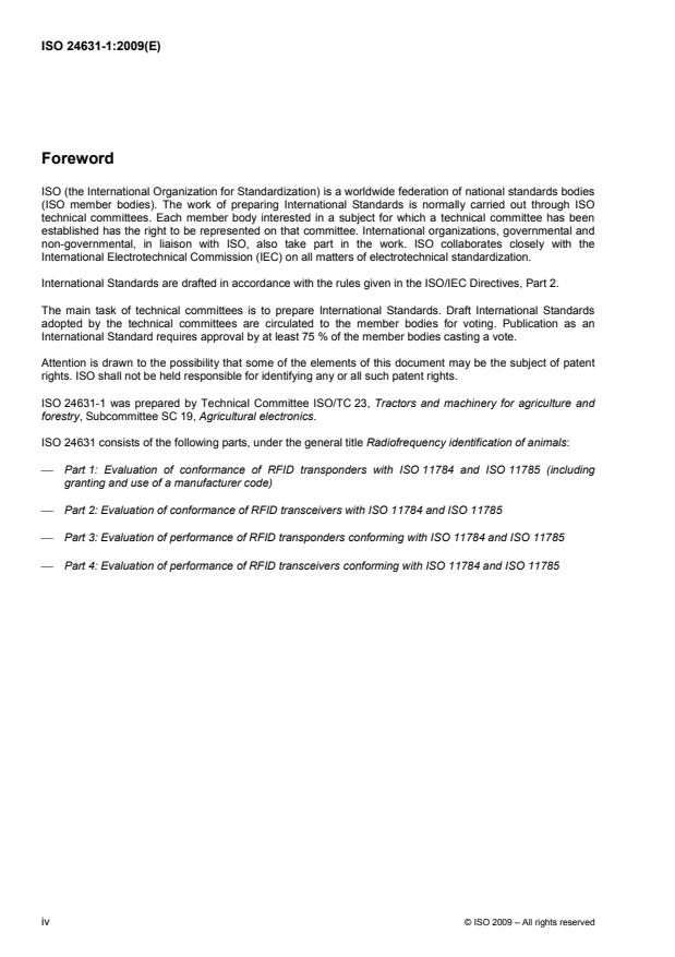ISO 24631-1:2009 is a standard published by the International Organization for Standardization (ISO). Its full title is "Radiofrequency identification of animals — Part 1: Evaluation of conformance of RFID transponders with ISO 11784 and ISO 11785 (including granting and use of a manufacturer code)". This standard covers: ISO 24631-1:2009 provides the means of evaluating the conformance with ISO 11784 and ISO 11785 of RFID (radiofrequency identification) transponders used in the individual identification of animals. It sets forth the conditions for the granting and use of the manufacturer code related to a transponder and the associated rights and obligations of the parties involved in the issuance of the code.