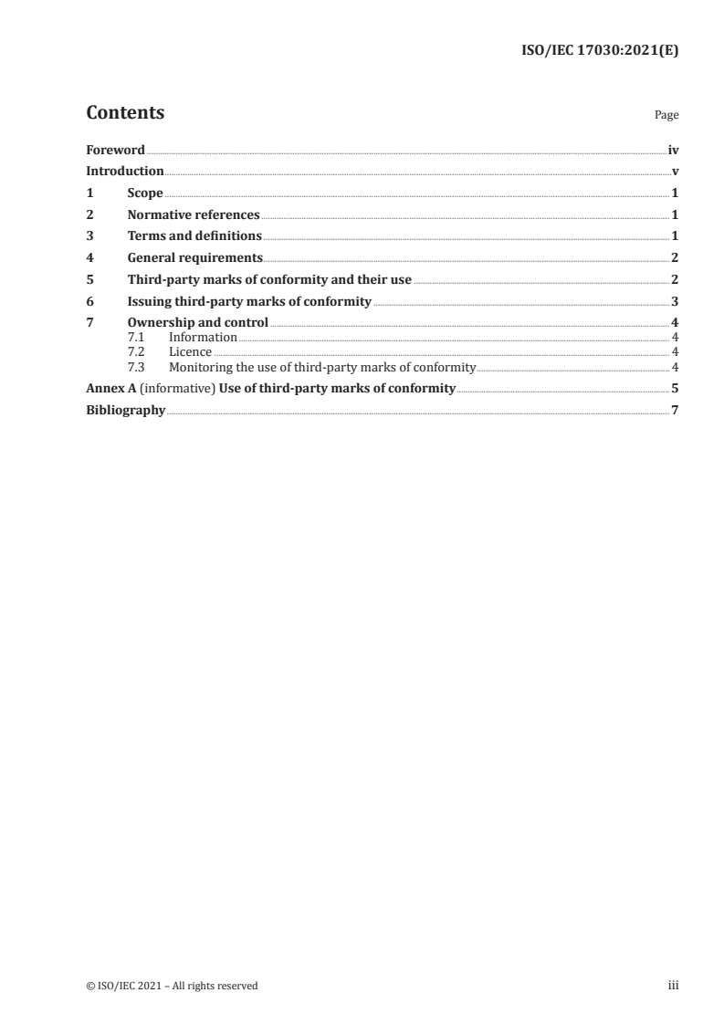 ISO/IEC 17030:2021 is a standard published by the International Organization for Standardization (ISO). Its full title is "Conformity assessment — General requirements for third-party marks of conformity". This standard covers: This document provides general requirements for third-party marks of conformity, including their issue and use. This document is applicable to third-party marks of conformity issued and used in different forms and various media, including digital representation employing electronically stored and displayed marks, machine readable code, blockchain (distributed ledger) or other electronic means. NOTE 1 This document can also be used as guidance in using marks of conformity in activities other than third-party conformity assessment. NOTE 2 Third-party marks of conformity in accordance with this document also include symbols of recognition, such as accreditation symbols. For consistency of terminology, they are referred to as accreditation marks. NOTE 3 Third-party marks of conformity in accordance with this document can include logos (e.g. the sign of a conformity assessment body or trademarks), symbols (e.g. the representation of recognition in an accreditation agreement or the depiction of the applicable programme) or a combination thereof. NOTE 4 Third-party marks of conformity as a graphic representation of demonstrated conformity in accordance with this document can be a combination of multiple marks (e.g. indications of compliance with several sets of specifications, codes for individually fulfilled specifications). NOTE 5 This document does not apply to markings that provide indication of a designation, a code, or a classification only. Furthermore, it does not apply to graphic representations (e.g. of conformity assessment systems or schemes/programmes) or logos (e.g. of an association of accreditation bodies or an association of conformity assessment bodies). NOTE 6 Third-party marks of conformity are based on a conformity assessment scheme that includes the function of surveillance.