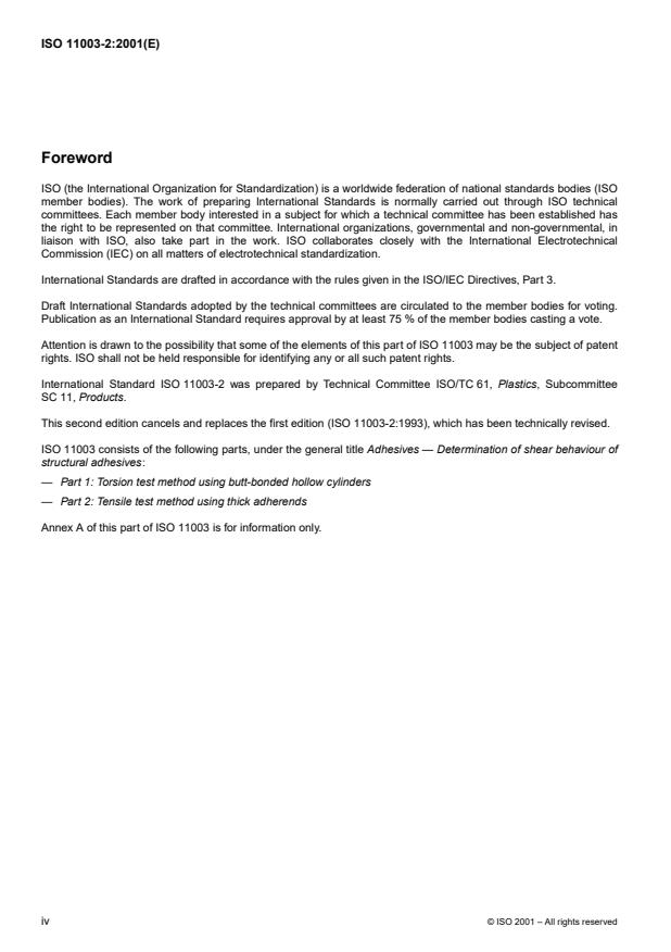 ISO 11003-2:2001 is a standard published by the International Organization for Standardization (ISO). Its full title is "Adhesives — Determination of shear behaviour of structural adhesives — Part 2: Tensile test method using thick adherends". This standard covers: Adhesives — Determination of shear behaviour of structural adhesives — Part 2: Tensile test method using thick adherends