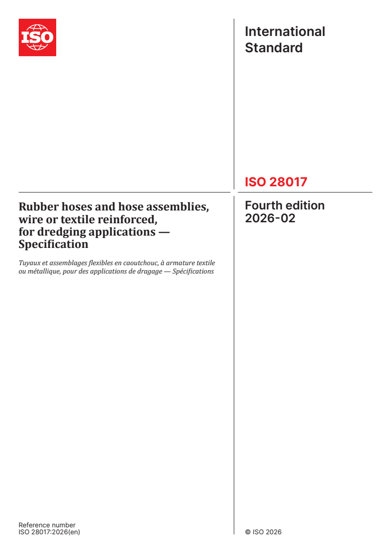 ISO 28017:2026 - Rubber hoses and hose assemblies, wire or textile reinforced, for dredging applications — Specification