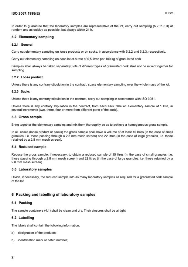 Standard applies solely to loose granulated cork prior to any pressing, despatch from the silos, or packing in sacks.