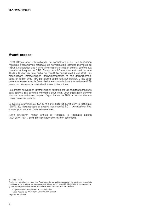 ISO 2574:1994 is a standard published by the International Organization for Standardization (ISO). Its full title is "Aircraft — Electrical cables — Identification marking". This standard covers: Specifies the way in which single-core, multi-core and coaxial cables used in the wiring of aircraft are to be marked as to type, size, origin, date etc. in order to facilitate servicing, the investigation of faults and replacement. Also specifies the approved methods for the marking of cores. Supplements those standards relating to marking that already exist. Allows for the codification of manufacturer's identities by individual countries.