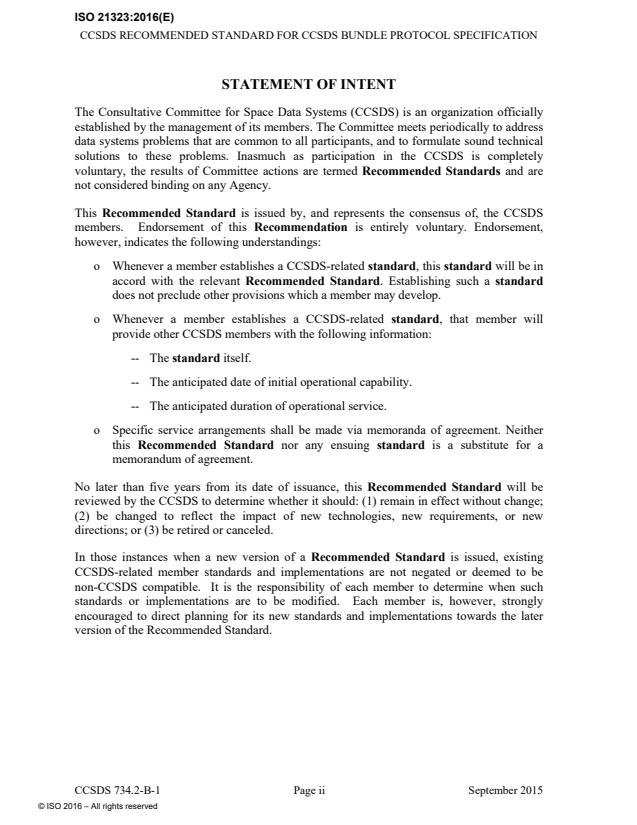 ISO 21323:2016 is designed to be applicable to any kind of space mission or infrastructure that is communication-resource poor and is subject to long latencies and/or temporary network partitions, regardless of complexity. It is intended that this Recommended Standard become a uniform standard among all CCSDS Agencies. In addition, this specification exists to utilize the underlying service of various internetworking protocols both onboard and in transit between ground and space-based assets. ISO 21323:2016 is intended to be applied to all systems that claim conformance to the CCSDS Bundle Protocol. It is agnostic to the choice of underlying transmission protocol in that BP can function over AOS, Space Packet, Proximity-1 Space Link Protocol, and various Internet and ground based protocols. The CCSDS believes it is important to document the rationale underlying the recommendations chosen, so that future evaluations of proposed changes or improvements will not lose sight of previous decisions. The concept and rationale for the use of a bundle protocol in space links may be found in reference [H1].