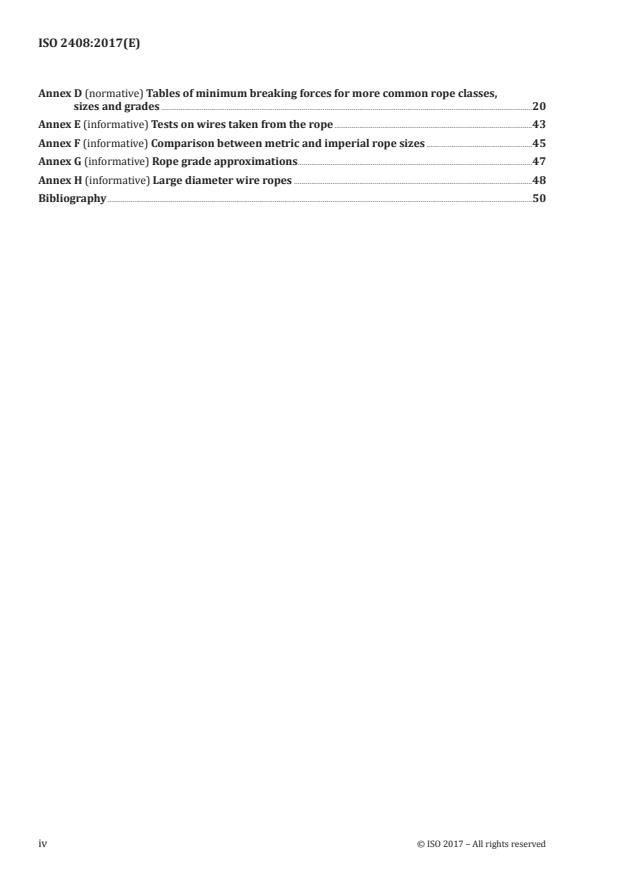 - Annexes: include dimensional/mechanical wire data, sampling and acceptance criteria for series production, calculation methods and tables of minimum breaking forces, metric–imperial comparisons, and guidance on large-diameter ropes.