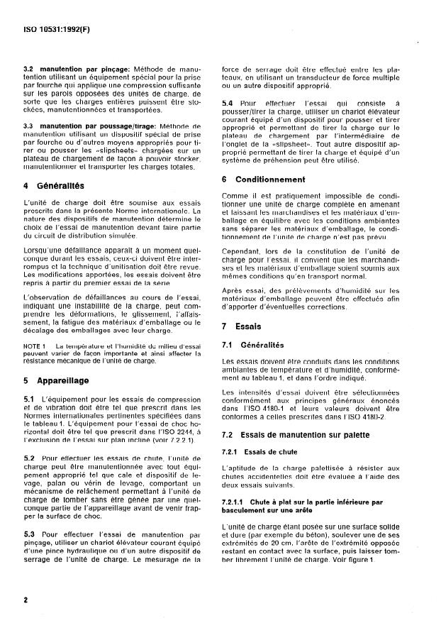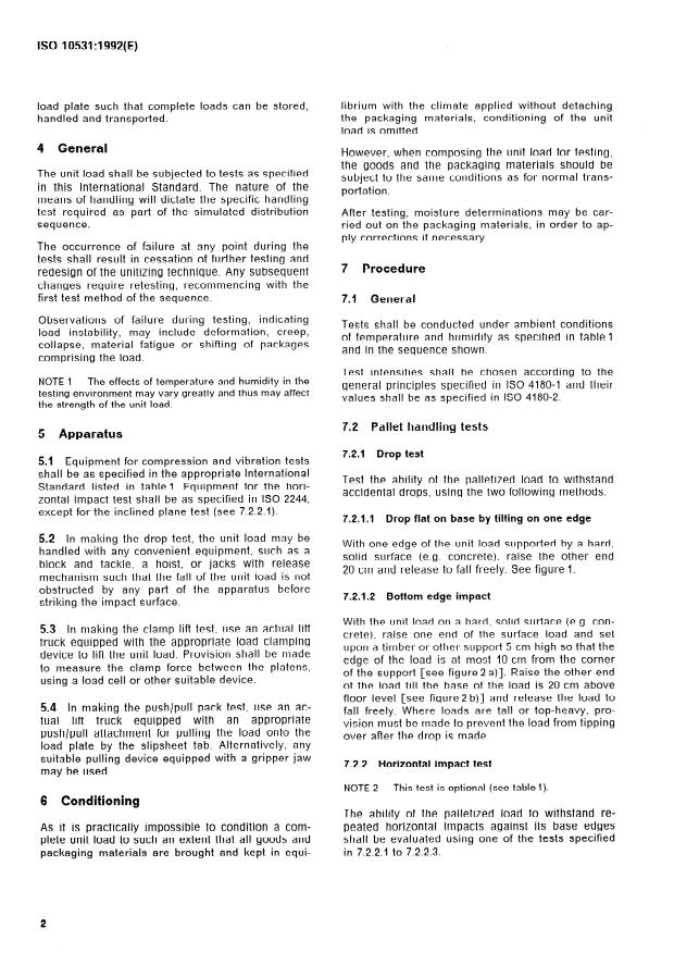 ISO 10531:1992 - "Packaging - Complete, filled transport packages - Stability testing of unit loads" specifies test methods to assess the stability and performance of complete, filled unit loads (palletized loads, pallet boxes, slipsheeted loads, or single items prepared for handling) under land transport, storage and handling hazards. The standard covers sequences of tests (compression, drop, vibration, handling) that simulate real-world distribution stresses and defines how to examine and report failures. Marine environments are explicitly excluded.