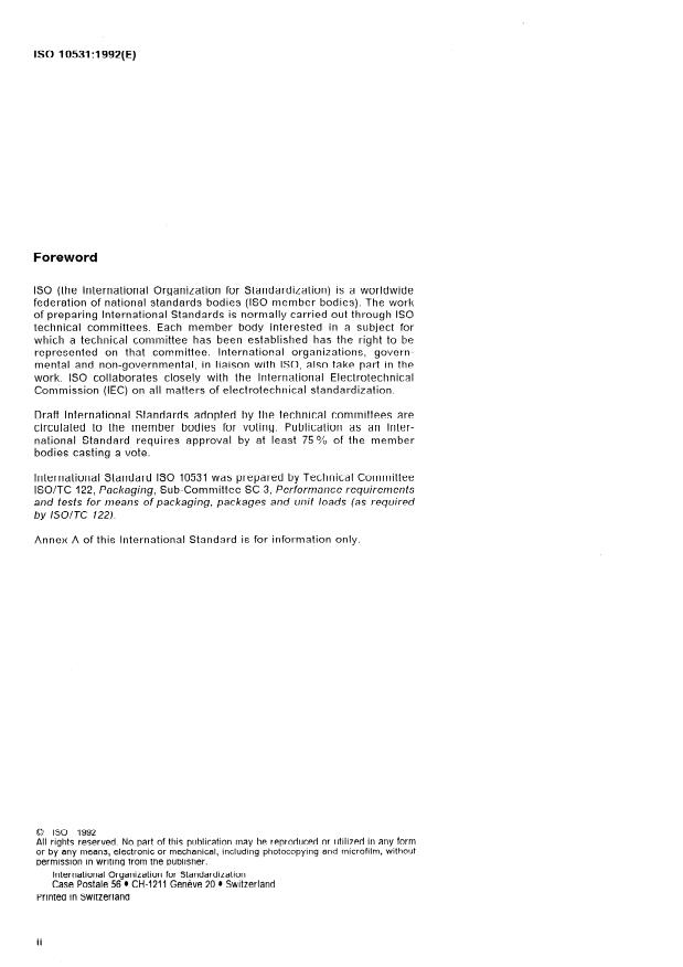 Normative references cited in ISO 10531 include: ISO 2234, ISO 2244, ISO 2247, ISO 2874, ISO 3676, ISO 4180-1 / 4180-2, ISO 8318 - all covering specific vibration, impact and compression test methods referenced by this standard.