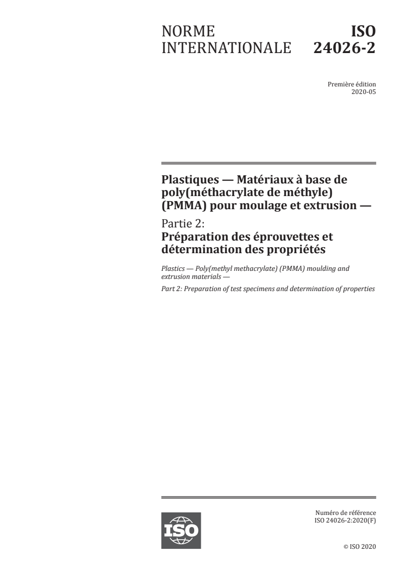 ISO 24026-2:2020 - Plastics — Poly(methyl methacrylate) (PMMA) moulding and extrusion materials — Part 2: Preparation of test specimens and determination of properties Released:5/29/2020