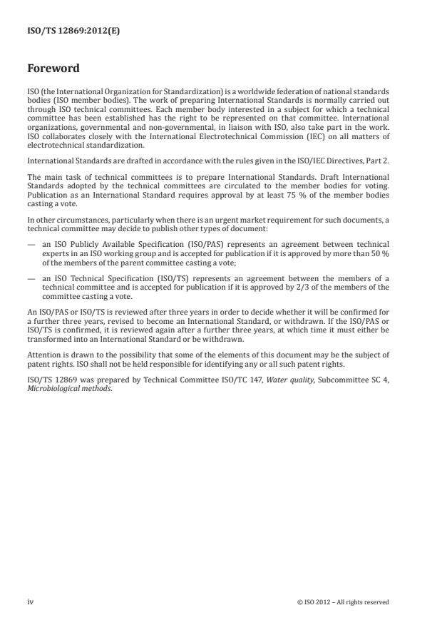 ISO/TS 12869:2012 is a technical specification published by the International Organization for Standardization (ISO). Its full title is "Water quality — Detection and quantification of Legionella spp. and/or Legionella pneumophila by concentration and genic amplification by quantitative polymerase chain reaction (qPCR)". This standard covers: ISO/TS 12869:2012 specifies a method for the detection and quantification of Legionella spp. and L. pneumophila using a quantitative polymerase chain reaction (qPCR). It specifies general methodological requirements, performance evaluation requirements, and quality control requirements. Technical details specified in ISO/TS 12869:2012 are given for information only. Any other technical solutions complying with the performance requirements are suitable. ISO/TS 12869:2012 is intended to be applied in the bacteriological investigation of all types of water (both hot and cold), unless the nature and/or content of suspended matter and/or accompanying flora interfere with the determination. This interference can result in an adverse effect on both the detection limit and the quantification limit. The results are expressed as the number of genome units of Legionella spp. and/or L. pneumophila per litre of sample. The method described in ISO/TS 12869:2012 is applicable to all types of water. However, some additives, e.g. chemicals used for water treatment, can interfere with and/or affect the sensitivity of the method. The qPCR methods do not give any information about live or dead cells.