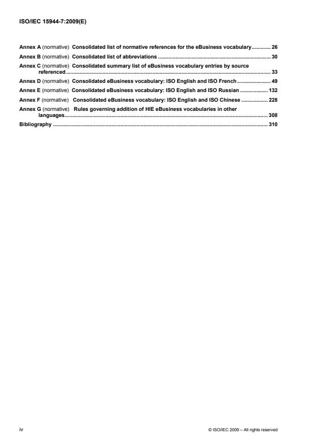 ISO/IEC 15944-7:2009 is a standard published by the International Organization for Standardization (ISO). Its full title is "Information technology - Business operational view - Part 7: eBusiness vocabulary". This standard covers: This document provides a consolidated vocabulary of eBusiness concepts as found and defined in the current editions of ISO/IEC 14662 and the existing parts of ISO/IEC 15944, namely, ISO/IEC 15944-1, ISO/IEC 15944-2, ISO/IEC 15944-4, ISO/IEC 15944-5, ISO/IEC 15944-6, ISO/IEC 15944-7, ISO/IEC 15944-8, ISO/IEC 15944-9, ISO/IEC 15944-10, ISO/IEC 15944-12, ISO/IEC 15944-16, ISO/IEC 15944-17, ISO/IEC 15944-20 and ISO/IEC 15944-21 along with their associated terms. This document provides the rules, guidelines and procedures governing the formation of definitions for concepts relevant to eBusiness and choice of terms as a single, harmonized and integrated controlled vocabulary. This includes those governing multilingual expandability which incorporates and integrates cultural capability. As such, This document facilitates the production of human interface equivalents (HIEs) of eBusiness terms and their definitions in the various official (and de facto) languages of ISO members in the form of additional annexes to this document. This document identifies the essential elements of an entry in this controlled vocabulary as well as their rules and specifications. It also includes rules for ensuring quality and integrity control requirement for each entry and the interworking among the entries while doing so in an IT-enabled manner. It also addresses maintenance and update procedures.