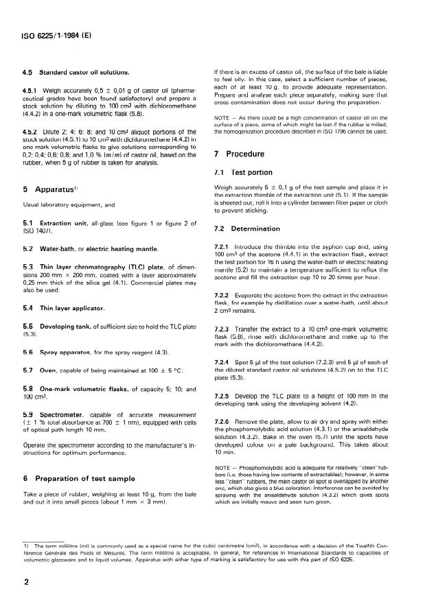 ISO 6225-1:1984 is a standard published by the International Organization for Standardization (ISO). Its full title is "Rubber, raw, natural — Determination of castor oil content — Part 1: Determination of castor oil glycerides content — Thin layer chromatographic method". This standard covers: The addition of the mentioned ingredient is intended to facilitate crumbing. This part of standard aids the estimation of the amount of oil remaining in the rubber. Triglyceride of ricinoleic acid is the principal constituent of castor oil (80...85 %). Method applicable to all grades of natural rubber. Lower limit of detection approx. 0.05 % of castor oil glycerides. - Part 2 of this standard refers to the total ricinoleic acid content.