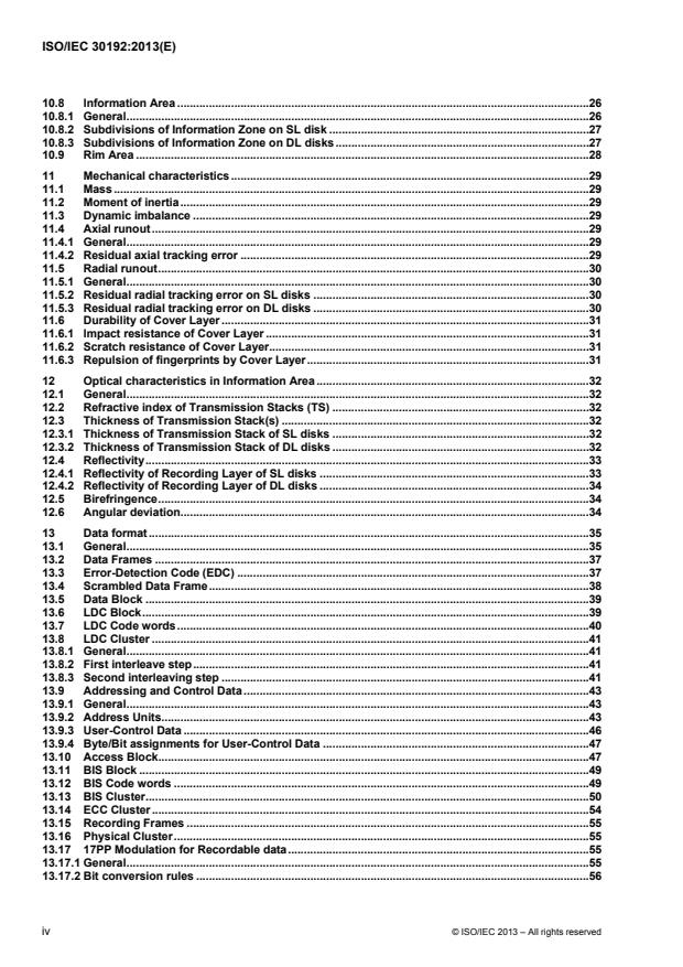 ISO/IEC 30192:2013 is a standard published by the International Organization for Standardization (ISO). Its full title is "Information technology — Digitally recorded media for information interchange and storage — 120 mm Single Layer (25,0 Gbytes per disk) and Dual Layer (50,0 Gbytes per disk) BD Rewritable disk". This standard covers: ISO/IEC 30192:2013 specifies the mechanical, physical and optical characteristics of a 120 mm rewritable optical disk with a capacity of 25,0 Gbytes or 50,0 Gbytes. It specifies the quality of the recorded and unrecorded signals, the format of the data and the recording method, thereby allowing for information interchange by means of such disks. User data can be written, read and overwritten many times using a reversible method. A confoming disk is identified as a BD Rewritable disk. ISO/IEC 30192:2013 specifies two related but different Types of this disk, the conditions for conformance, the environments in which the disk is to be operated and stored, the mechanical and physical characteristics of the disk, which allow mechanical interchange between data processing systems, the format of the information on the disk, including the physical disposition of the Tracks and Sectors, the error-correcting codes and the coding method used, the characteristics of the signals recorded on the disk, which enable data processing systems to read data from the disk. ISO/IEC 30192:2013 provides for interchange of disks between drives. Together with a standard for volume and file structure, it provides for full data interchange between data processing systems.