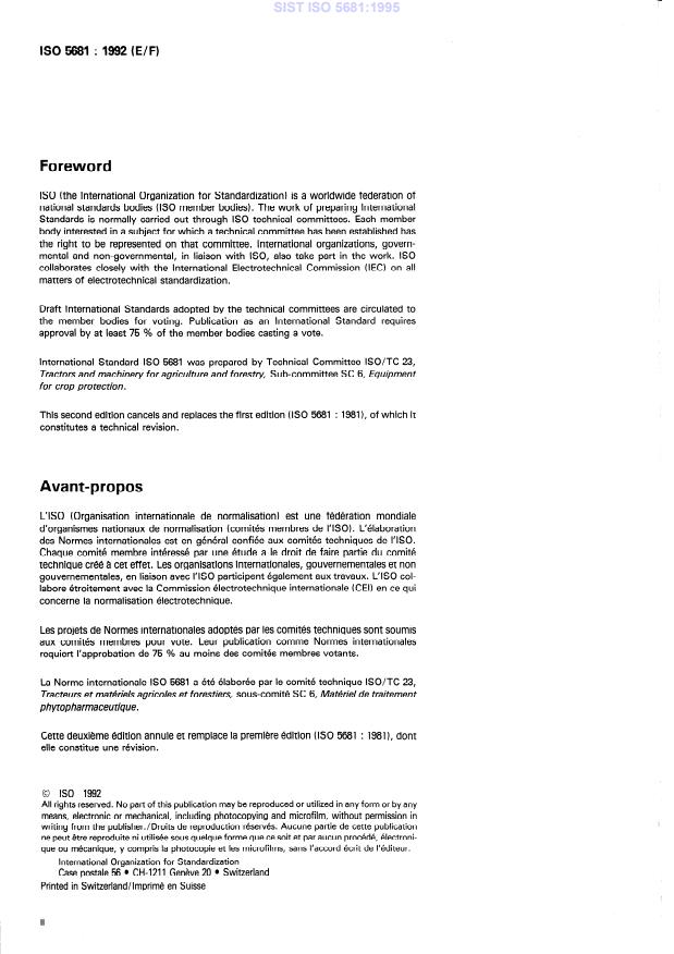 ISO 5681:1992 is a standard published by the International Organization for Standardization (ISO). Its full title is "Equipment for crop protection — Vocabulary". This standard covers: Defines 9 general terms, 146 terms for equipment for applying sprays, 11 terms for equipment for applying dust, 8 terms for equipment for applying granules, and 23 other terms.