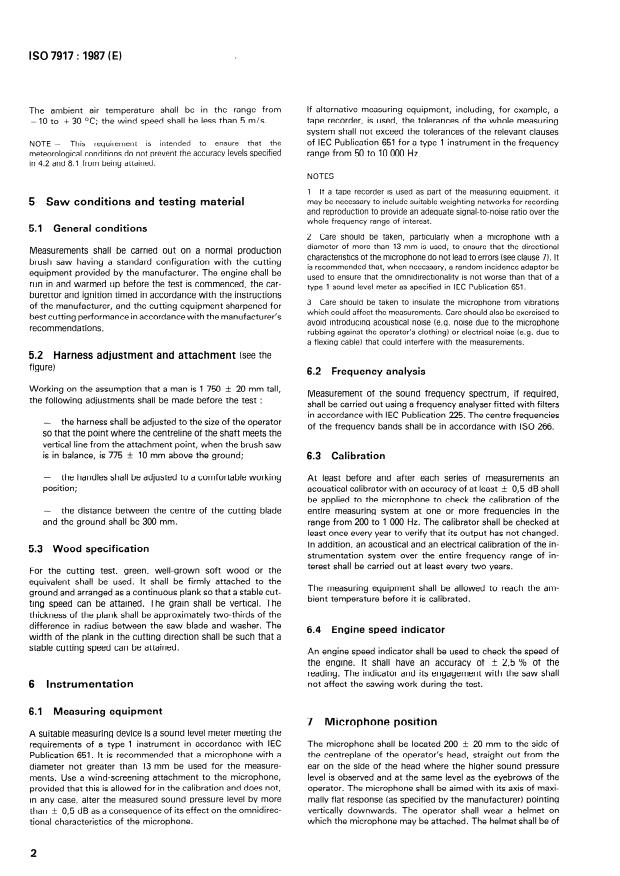 ISO 7917:1987 is a standard published by the International Organization for Standardization (ISO). Its full title is "Acoustics — Measurement at the operator's position of airborne noise emitted by brush saws". This standard covers: Specifies a method for measuring the A-weighted and octave-band sound pressure levels of noise emission of portable, hand-held saws for use primarily in forestry which are powered by internal combustion engines.