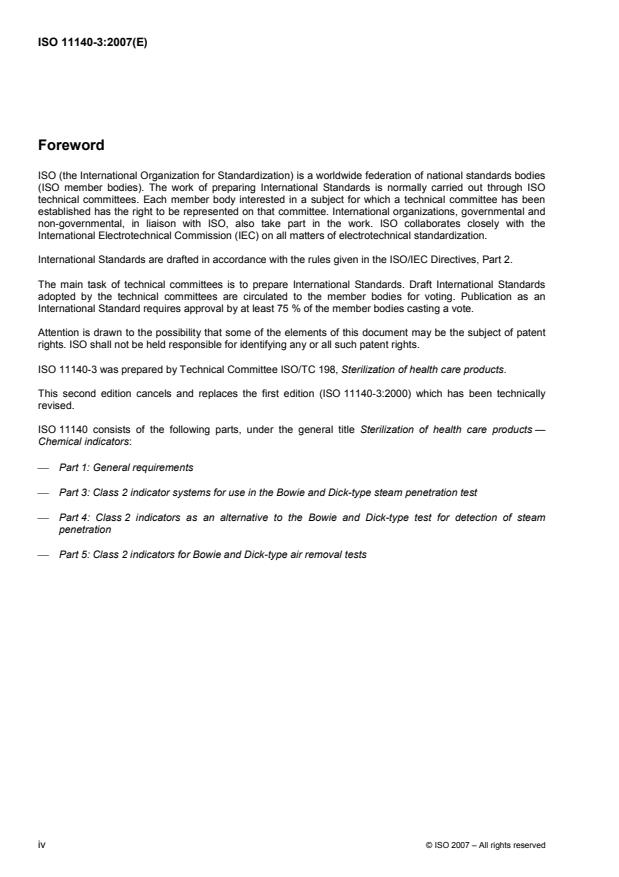 ISO 11140-3:2007 is a standard published by the International Organization for Standardization (ISO). Its full title is "Sterilization of health care products — Chemical indicators — Part 3: Class 2 indicator systems for use in the Bowie and Dick-type steam penetration test". This standard covers: ISO 11140-3:2007 specifies the requirements for chemical indicators to be used in the steam penetration test for steam sterilizers for wrapped goods, e.g. instruments and porous materials. The indicator for this purpose is a Class 2 indicator as described in ISO 11140-1. Indicators complying with ISO 11140-3:2007 are intended for use in combination with the standard test pack as described in EN 285. ISO 11140-3:2007 does not consider the performance of the standard test pack, but does specify the performance of the indicators.